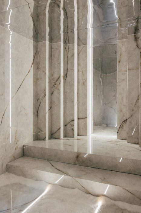 Para escenificar el progreso moderno, la superficie interior se ha escogido en el modelo Neolith Himalaya Crystal, en un acabado pulido. Su juego de láminas espejadas y sus vetas visibles juegan con la idea de que el ascenso hacia lo divino refleja, tanto el entorno, como a los mismos visitantes.