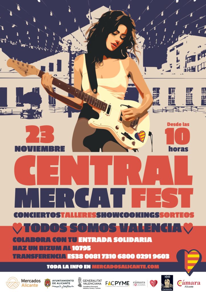 Alicante celebra este próximo sábado, 23 de noviembre, en el Mercado Central una nueva edición del ‘Central Mercat Fest’, un festival cultural y gastronómico que se ha convertido ya en un referente de éxito en la ciudad de Alicante. En esta edición, la cita será especial, ya que tiene lugar en el marco de la celebración de los 102 años de la inauguración del emblemático Mercado, y el evento va a ser solidario y recaudará fondos para la DANA a través de la compra de una entrada solidaria para ayudar y colaborar con Alicante Gastronómica Solidaria en la elaboración y reparto de menús calientes entre los afectados y voluntarios en la provincia de Valencia.