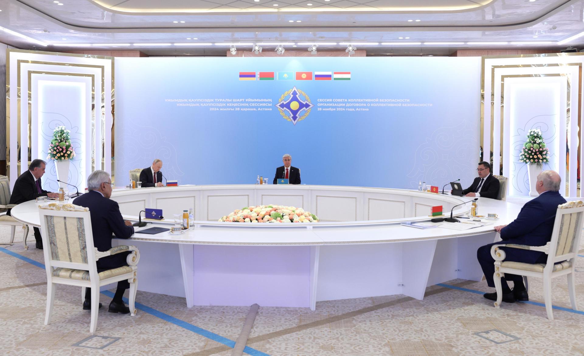 (De izq. a der.) El secretario general de la Organización del Tratado de Seguridad Colectiva, Imangali Tasmagambetov, el presidente de Tayikistán, Emomali Rahmon, el presidente de Rusia, Vladimir Putin, el presidente de Kirguistán, Sadyr Japarov, el presidente de Kazajistán, Kassym-Jomart Tokayev, y el presidente de Bielorrusia, Alexander Lukashenko, asisten a la sesión del Consejo de Seguridad Colectiva (CSC) de la Organización del Tratado de Seguridad Colectiva (OTSC) en Astana, el 28 de noviembre de 2024. EFE/EPA/GAVRIIL GRIGOROV / SPUTNIK / GRUPO DEL KREMLIN