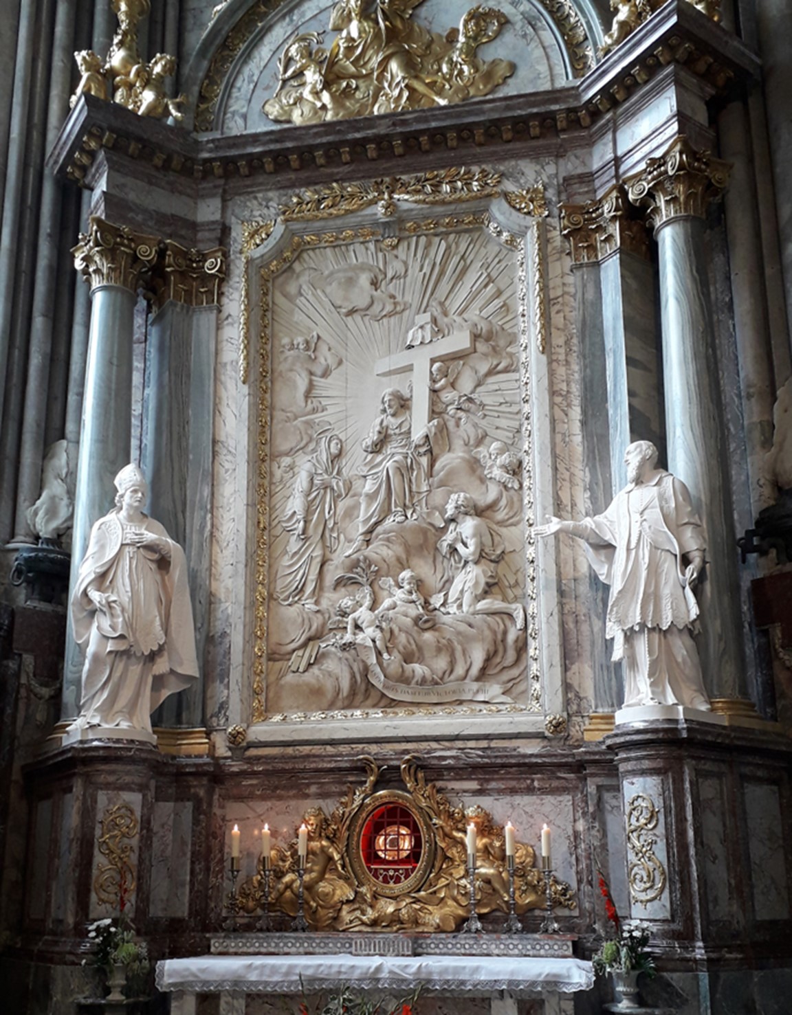 L’évêque demanda à l’architecte Gilles Oppenord (1672-1742) le projet et le devis d’un décor et d’un autel en marbre avec retable. La maîtrise d’ouvrage fut confiée au chanoine Maximilien Filleux qui signa les marchés avec les artisans : la sculpture fut confiée à Jean-Baptiste Poultier (1653-1719), sculpteur ordinaire du roi ; les marbres furent taillés et posés par Pierre Malleroy, maître marbrier à Paris.