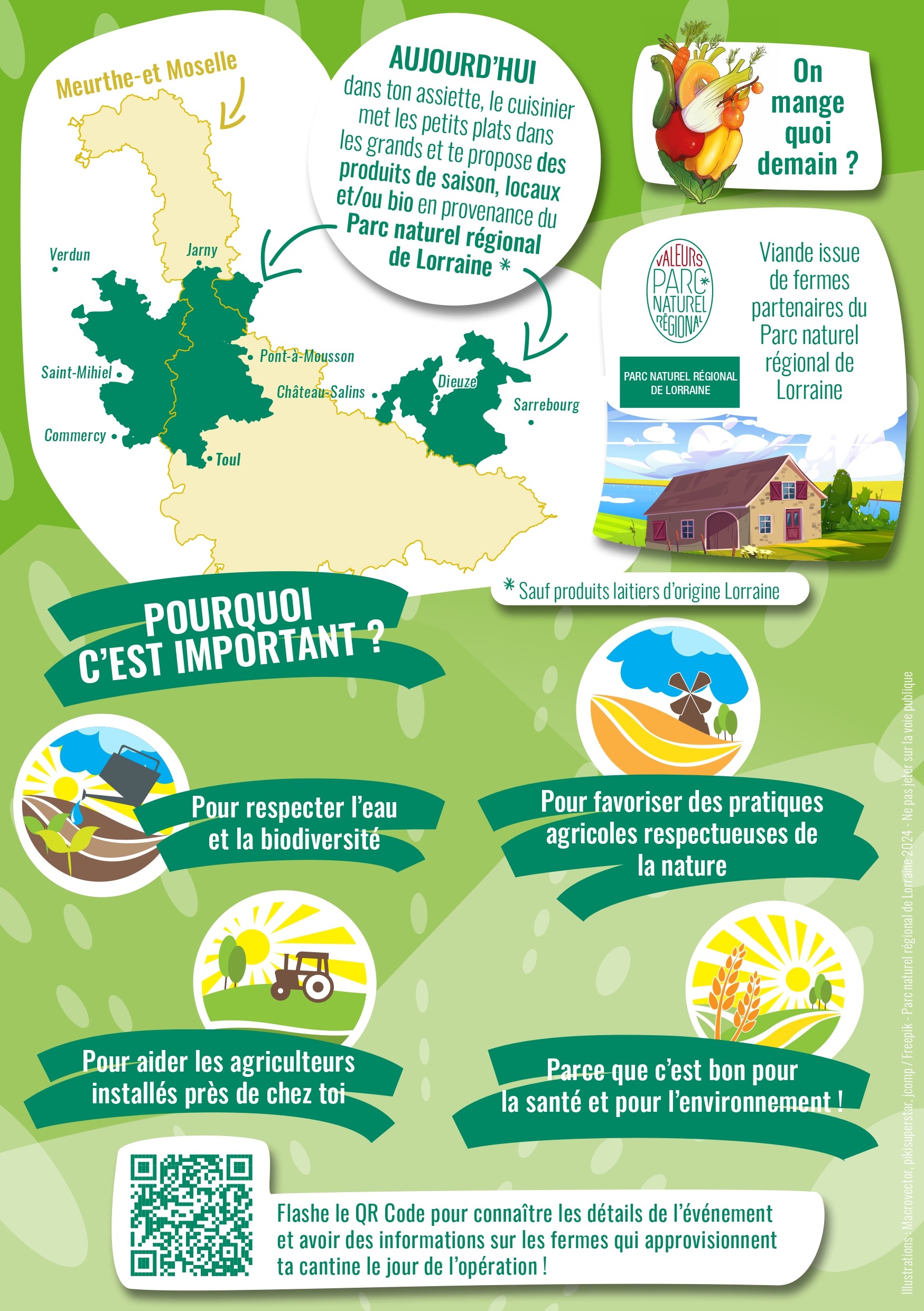 Le Conseil Départemental de Meurthe-et-Moselle, le Parc naturel régional de Lorraine et la Chambre d’agriculture s’associent pour proposer un menu élaboré à partir de produits bio, locaux et de saison majoritairement issues du territoire du Parc dans les services de restauration des collèges du département.