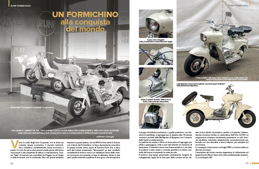 Tra Vespa e Lambretta, nel 1954 la Rumi lancia la sua arma per conquistare il mercato degli scooter. Il suo Formichino ha una linea inconfondibile che oggi conquista il cuore degli appassionati di due ruote.
