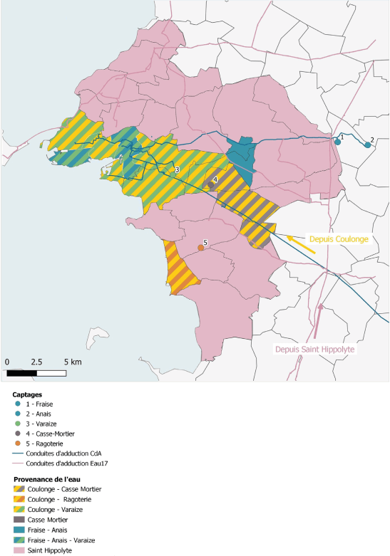 - Les nappes souterraines, en Saintonge à proximité de l’usine de Coulonge, et en Aunis sur quatre secteurs: La Ragotterie (commune de Salles/Mer) pour l’alimentation de la Ville de Chatelaillon, Varaize (commune de Périgny), Casse-Mortier (commune de Clavette), et Fraise (commune de Vérines) / Anais. Cette dernière ressource alimente la commune de La Rochelle depuis un siècle.