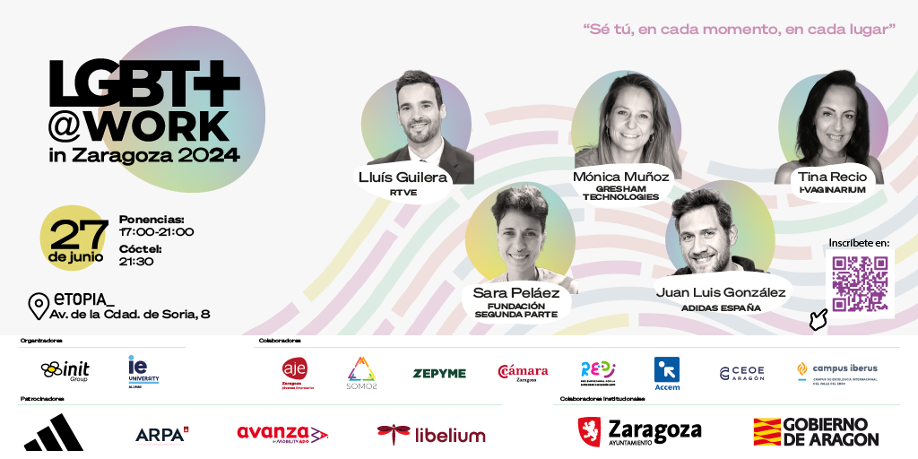 ‘LGBT+@work Zaragoza’ contará con el testimonio de Lluís Guilera, Presentador 24h Noticias en RTVE; Juan Luis González, Ingeniero Senior de Plataforma en ADIDAS ESPAÑA; Sara Peláez, Directora de Eventos y Alianzas en FUNDACIÓN SEGUNDA PARTE; Mónica Muñoz, Directora de Ventas Sur y Este de Europa en GRESHAM TECHNOLOGIES y Tina Recio, activista fundadora de I-VAGINARIUM; personas del colectivo LGBT+ que contarán en primera persona cómo su diversidad ha mejorado el desempeño de su compañía