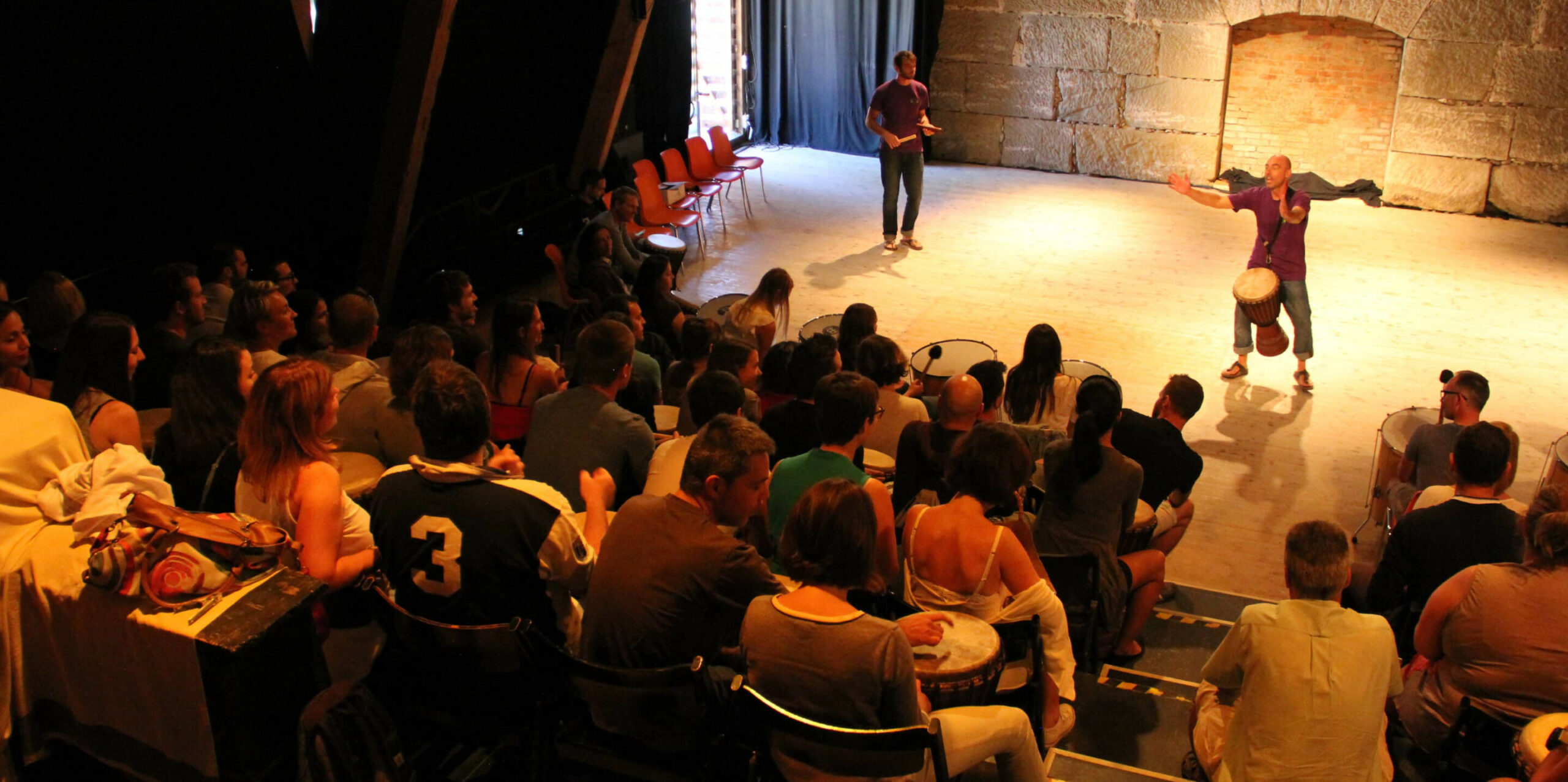 La batucada est une musique rythmique relativement complexe. Car elle se compose de plusieurs rythmes associés à des instruments différents. Même si les rythmes sont simples pris individuellement, c’est la multiplication des pupitres qui donne la complexité. C’est donc, en première intention, l’écoute que nous cherchons à développer chez les participants. Cette capacité va grandir tout au long de l’animation et va naturellement impliquer chaque personne dans le travail d’ensemble. Au niveau du groupe, l’énergie déployée est souvent très impressionnante à observer, comme on peut le voir sur cette photo…