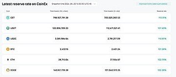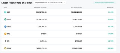 HONG KONG, June 24, 2024 /PRNewswire/ -- CoinEx [http://www.coinex.com/], a leading crypto exchange, announced the update of its Asset Reserve Ratio on 24th June 2024 15:00 (UTC+8). This advancement underlines CoinEx's commitment to enhancing transparency, security, and trust within the cryptocurrency community.