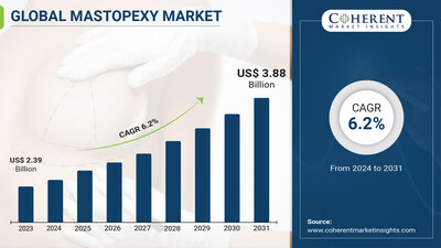 BURLINGAME, Calif., July 22, 2024 /PRNewswire/ -- The global Mastopexy Market [https://www.coherentmarketinsights.com/industry-reports/global-mastopexy-market] is projected to grow from USD 2.39 billion in 2023 to USD 3.88 billion by 2031, with a compound annual growth rate (CAGR) of 6.2% from 2024 to 2031, as per a recent report by Coherent Market Insights. Increasing consumer spending on aesthetic procedures, changing lifestyles and social acceptance of plastic surgeries are promoting the demand for aesthetic breast surgeries globally. Mastopexy with or without implants is gaining traction as an effective method for lifting and reshaping saggy breasts for improved aesthetics. These factors are positively influencing the growth of the mastopexy market.