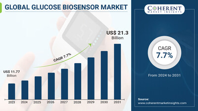 BURLINGAME, Calif., July 22, 2024 /PRNewswire/ -- The global Glucose Biosensor Market [https://www.coherentmarketinsights.com/industry-reports/global-glucose-biosensor-market] is projected to grow from USD 11.77 billion in 2023 to USD 21.3 billion by 2031, with a compound annual growth rate (CAGR) of 7.7% from 2024 to 2031, as per a recent report by Coherent Market Insights. Rising demand for self-monitoring blood glucose devices among diabetes patients in recent years owing to their ease of use and mobility. These devices allow flexible glucose monitoring through the day and night without needing to visit hospitals or diagnostic centers every time. They provide real-time glucose readings along with trends that help patients and healthcare professionals better understand fluctuations and accordingly manage insulin therapy.