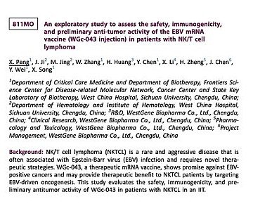 BARCELONA, Spain, Sept. 16, 2024 /PRNewswire/ -- WestGene Biopharma, a leading innovator in mRNA therapeutics, presented the latest clinical data for its EBV-positive tumour mRNA vaccine, WGc-043, during a mini-oral presentation at the European Society for Medical Oncology (ESMO) Congress 2024.