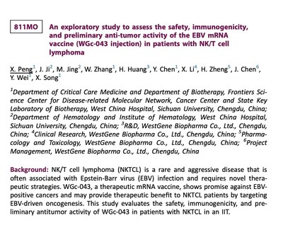 WGc-043, the world's first mRNA therapeutic vaccine targeting EBV-positive tumors to achieve IND approval in both China and the US, demonstrated exceptional safety, immunogenicity, and anti-tumor activity in the latest clinical trials. The vaccine is being developed specifically for adult patients with advanced EBV-positive solid tumours and refractory or relapsed EBV-positive lymphomas, diseases for which there are currently no effective, low-toxicity treatment options.