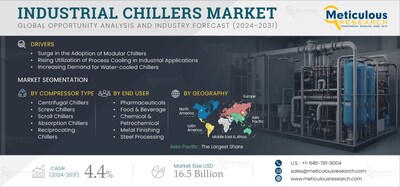 REDDING, Calif., Nov. 19, 2024 /PRNewswire/ -- According to a new market research report titled 'Industrial Chillers Market [https://www.meticulousresearch.com/product/industrial-chillers-market-6015?utm_source=PRnewswire&utm_medium=Paid&utm_campaign=Product&utm_content=19-10-2024] by Cooling Type (Air-cooled Chillers, Water-cooled Chillers), Compressor Type (Scroll Chillers, Absorption Chillers), Capacity, End User (Chemical & Petrochemical, Pharmaceuticals) and Geography--Global Forecast to 2031.
