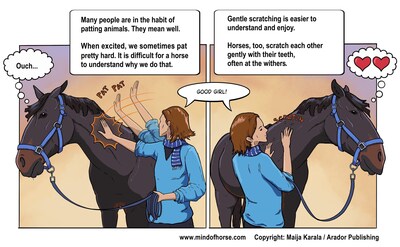Horses' social behaviour includes friendly scratching among familiar horses. Many horse enthusiasts recognize the scene: Two horses scratching each other's withers with their teeth while relaxing to enjoy the feeling. The scene illustrates another similarity between our felt experiences and those of animals such as horses. A friendly touch is such an important component of a horse's life that research has shown horse welfare to be better if horses can touch a familiar horse instead of just having visual contact with it, such as across the aisle of a stable.