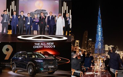 DUBAI, UAE, Dec. 23, 2024 /PRNewswire/ -- On December 19, TIGGO 9 was simultaneously launched in the UAE and Kuwait. The event was attended by Ms. Ou Boqian, Consul General of the Chinese Consulate in Dubai, Mr. Wang Xiaojia, Commercial Counsellor, and Mr. Zhang Guibing, General Manager of Chery International. Tim Zhang, General Manager of the Middle East region, Chery International, introduced Chery's strategic plans for the UAE/GCC market. At the launch event, the Kuwait Tower and the UAE Burj Khalifa lit up on the same day, symbolizing Chery's global ambitions and aspirations.
