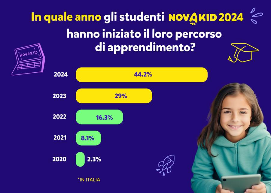 “La nostra crescita in Italia è stata incredibile, ma ciò che emerge è anche la fedeltà dei nostri clienti. Una volta che le famiglie iniziano il loro percorso di apprendimento con Novakid, restano con noi”, ha dichiarato Giulia Bettonte, Team Lead di Novakid Italia. Circa il 44% degli studenti Novakid in Italia si è iscritto alla piattaforma nel 2024, mentre il restante 56% si è iscritto negli anni precedenti con un incremento progressivo: 2,3% nel 2020, 8,1% nel 2021, 16,3% nel 2022, 29% nel 2023 (si veda l’infografica sotto).