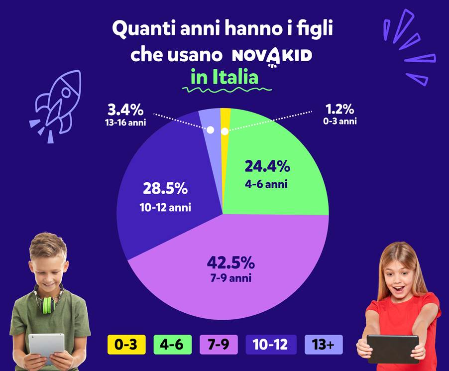 Novakid è specializzata nella fascia di età 4-12 anni, di cui gli studenti tra i 7 e i 9 anni rappresentano la maggioranza (42,5%). A seguire, la fascia più numerosa è quella dei 10-12 anni, mentre in terza posizione quella 4-6 anni (con il 24,4%). Restano poi piccole percentuali che comprendono la fascia 12-13 anni e quella dei piccolissimi (meno di 4 anni) con rispettivamente il 3,4 e l’1,2% degli iscritti (vedere infografica sotto).