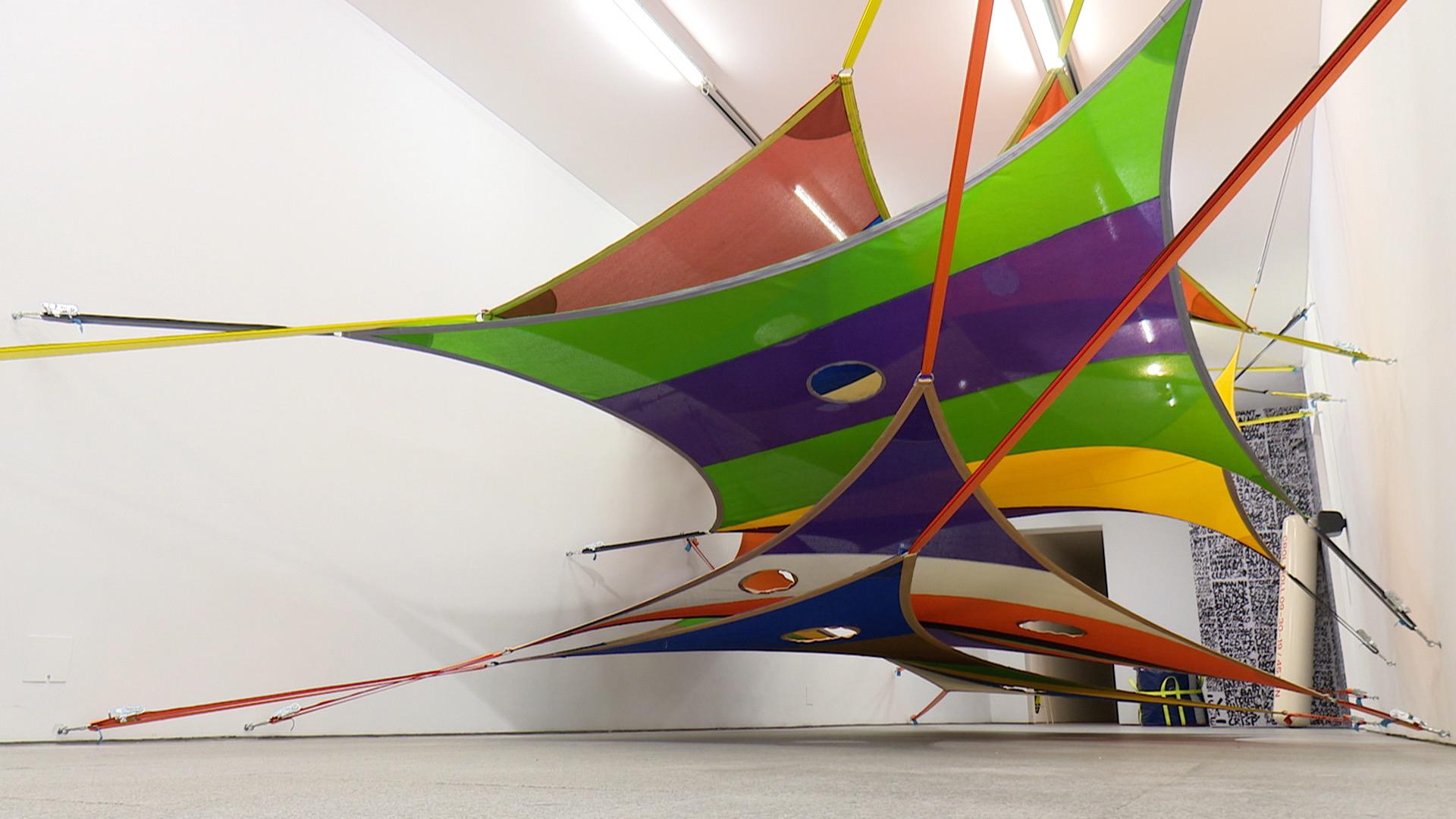 Así, unas grandes lonas tensadas de pared a pared son la base para una investigación sobre la interacción entre las corrientes de vientos y los flujos de aire producidos por la voz humana, mientras que una estructura que recuerda a un abrevadero de ganado sirve para investigar la sonoridad del agua y de la voz humana en contacto con ella a través de canciones, salpicaduras, tragos y gorgoteos.