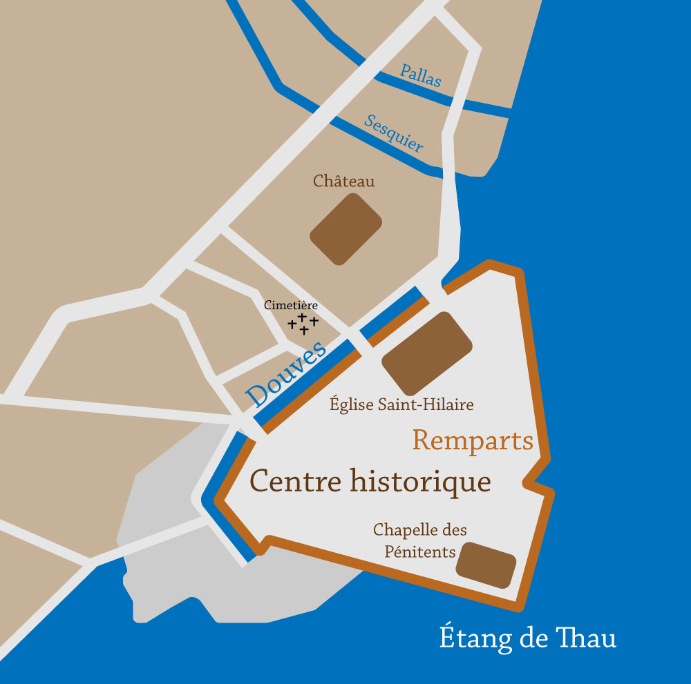 Sur la place Aristide Briand, les fouilles ont permis d’exhumer une partie des anciens remparts qui ceinturaient Mèze au moyen âge. Elles ont aussi permis de mettre à jour des bâtis en pierre qui pourraient être associés à la présence des douves qui longeaient autrefois les fortifications de la cité (voir schéma).
