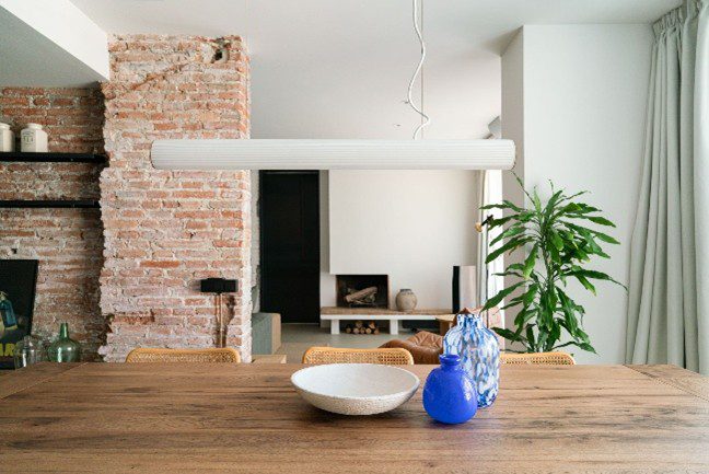 - El recurso de la pared maestra de ladrillo visto como elemento articulador de la zona de día, la sofisticación industrial de la cocina, un meticuloso estudio de la luz y el cuidado por cada detalle de mobiliario a medida marcan el encanto especial de esta vivienda familiar.