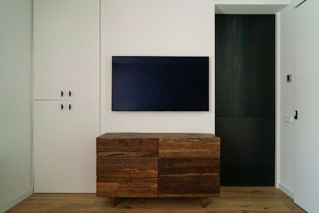 La zona de día se organiza alrededor de un elemento estructural clave: una pared maestra de ladrillo visto recuperado, en homenaje a la materialidad original del edificio. Además de su función estética, la pared actúa como nexo organizador entre el salón, la cocina y el comedor, articulando visualmente el conjunto.
