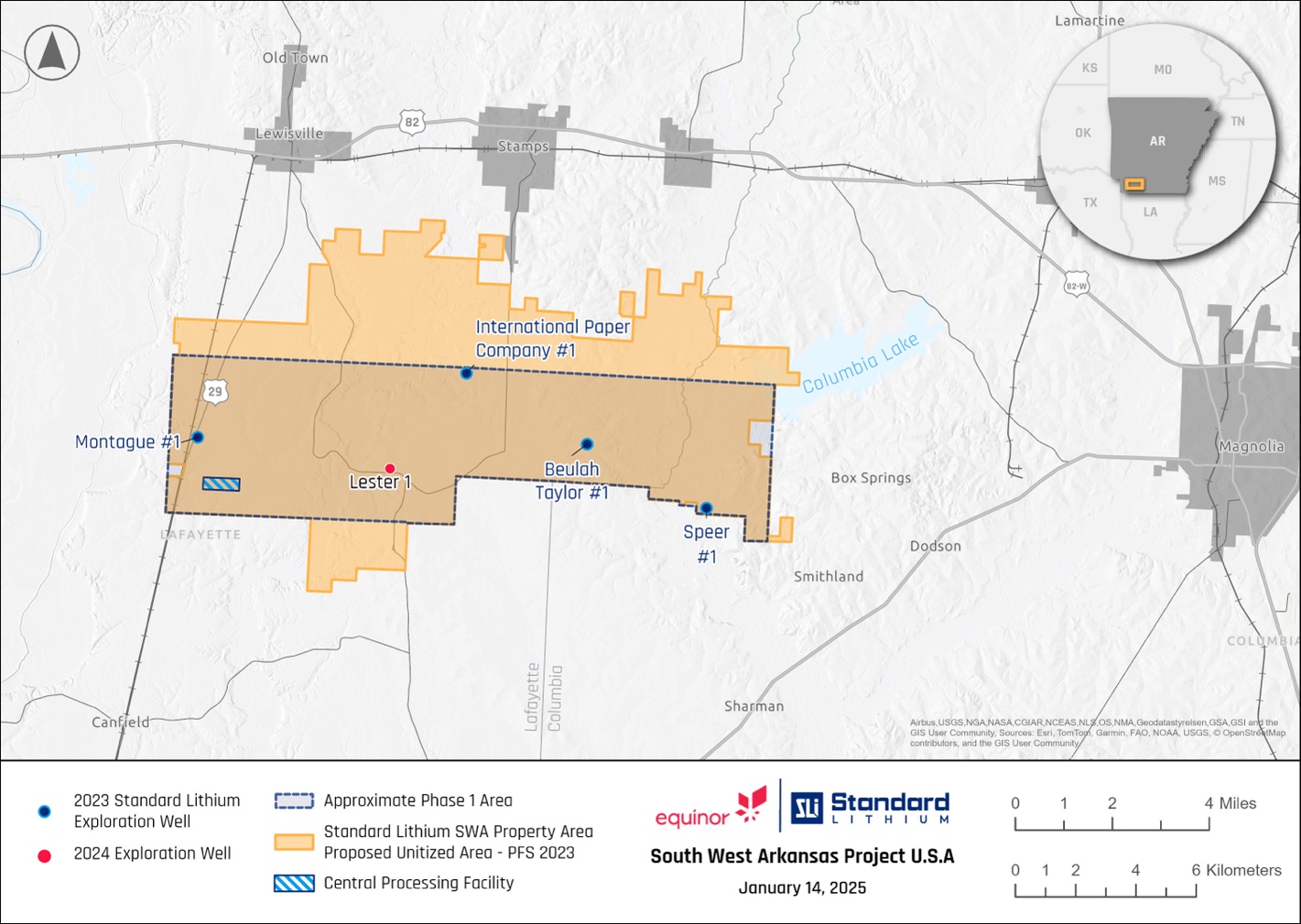 LOUISVILLE, Ark., Jan. 15, 2025 (GLOBE NEWSWIRE) -- SWA Lithium, the Joint Venture between Standard Lithium Ltd. (“Standard Lithium” or the “Company”) (TSXV: SLI) (NYSE American: SLI) and Equinor ASA (“Equinor”) which is developing the South West Arkansas Project (“SWA” or the “Project”), is pleased to announce that it has successfully commenced drilling a new well into the Smackover Formation at the Project. The well is currently at a depth of approximately 8,000’ below surface (2,438 m), and has a targeted total depth of 9,600’ (2,926 m). SWA Lithium is also undertaking an extensive field program to re-enter the wells drilled in 2023 to conduct detailed reservoir testing and brine sampling work.