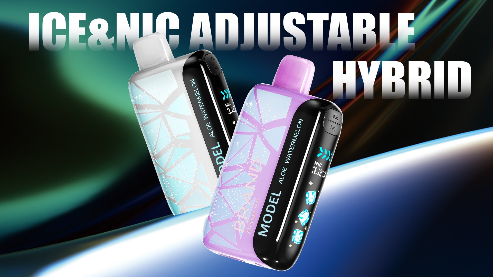 The hybrid-powered vaping product features an internal Triple-Tank System (Nicotine/Ice/Flavor pods inside) and a dynamic interactive interface, allowing users to control via dual physical buttons:
