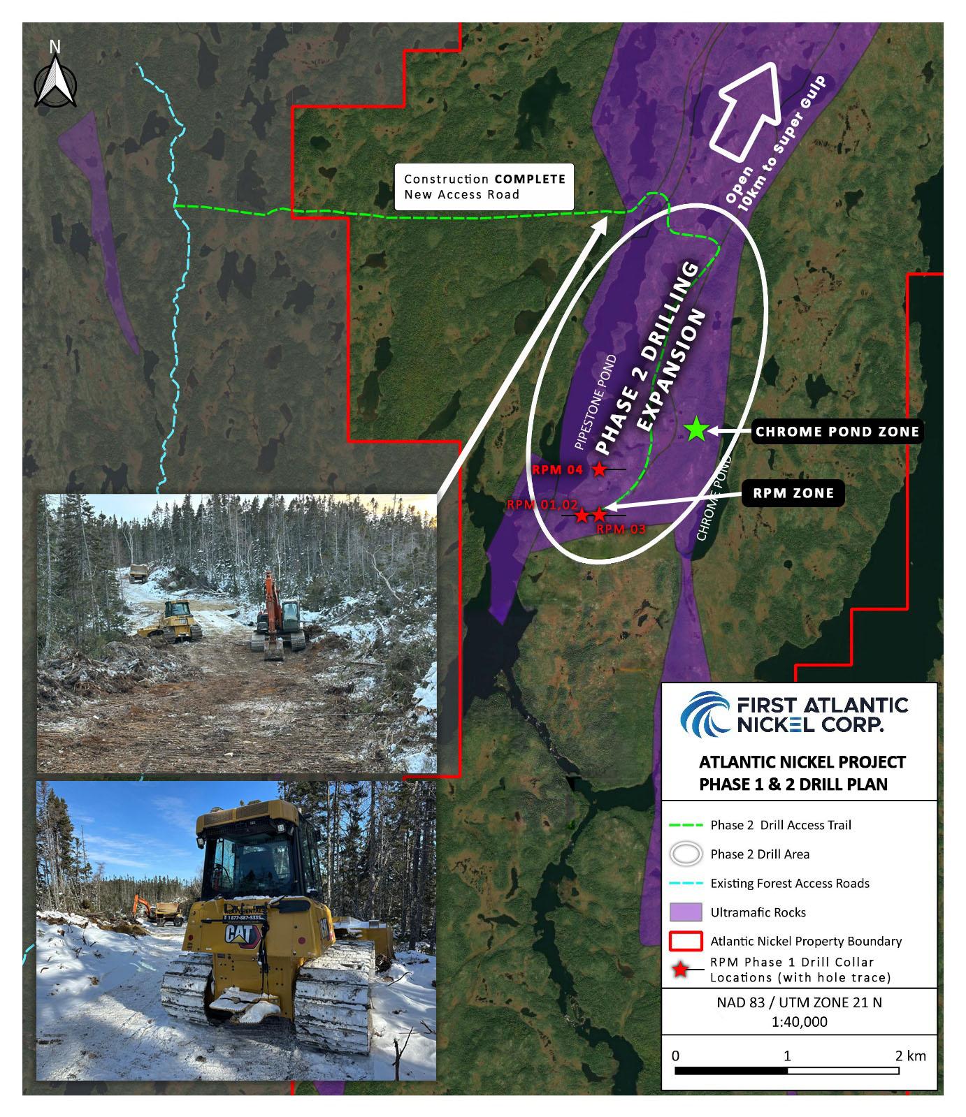 Figure 4: Atlantic Nickel Project Phase 2 Drill Plan map, showing drill collar locations from Phase 1 drilling and the recently completed new access road to RPM Zone.