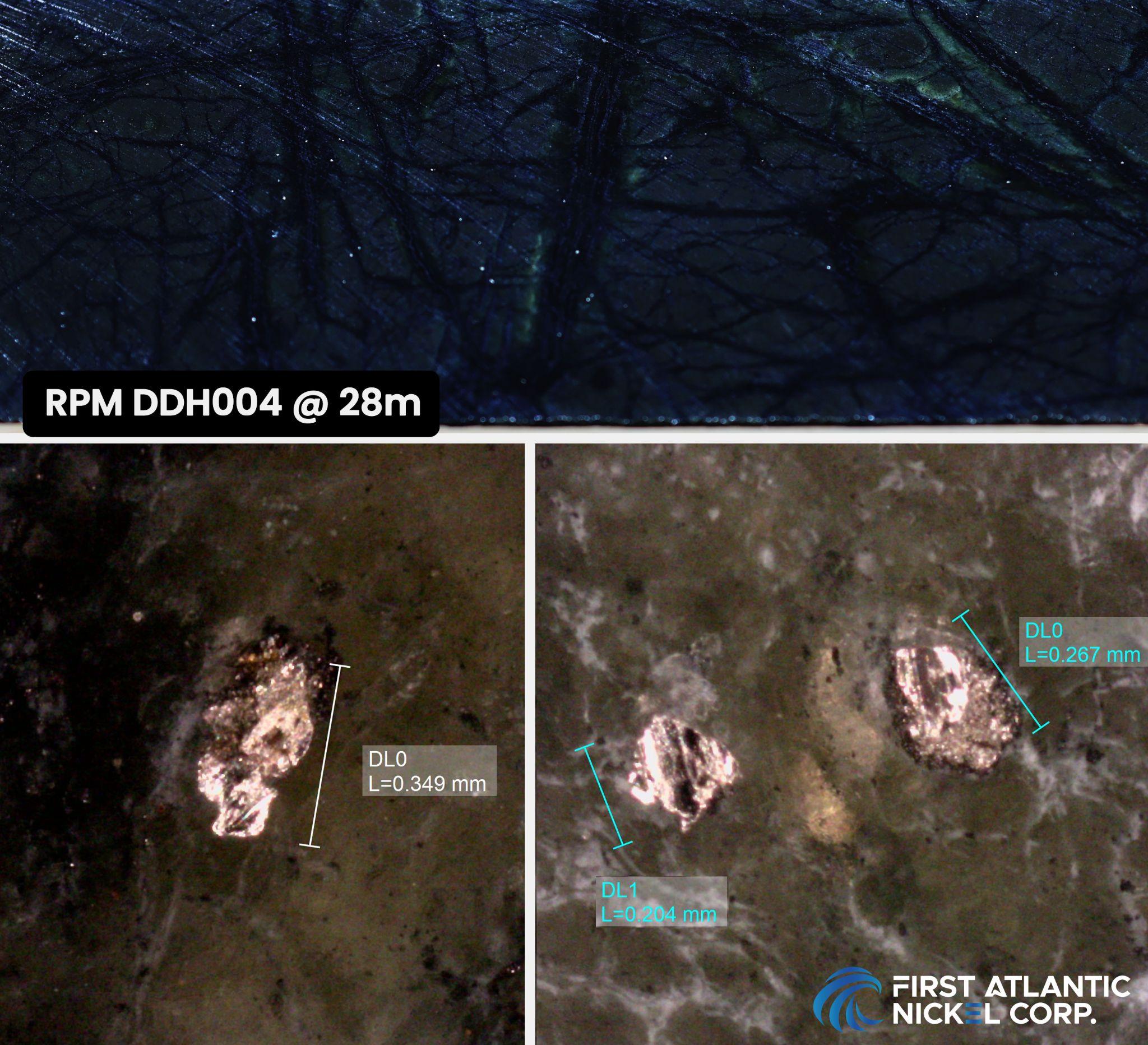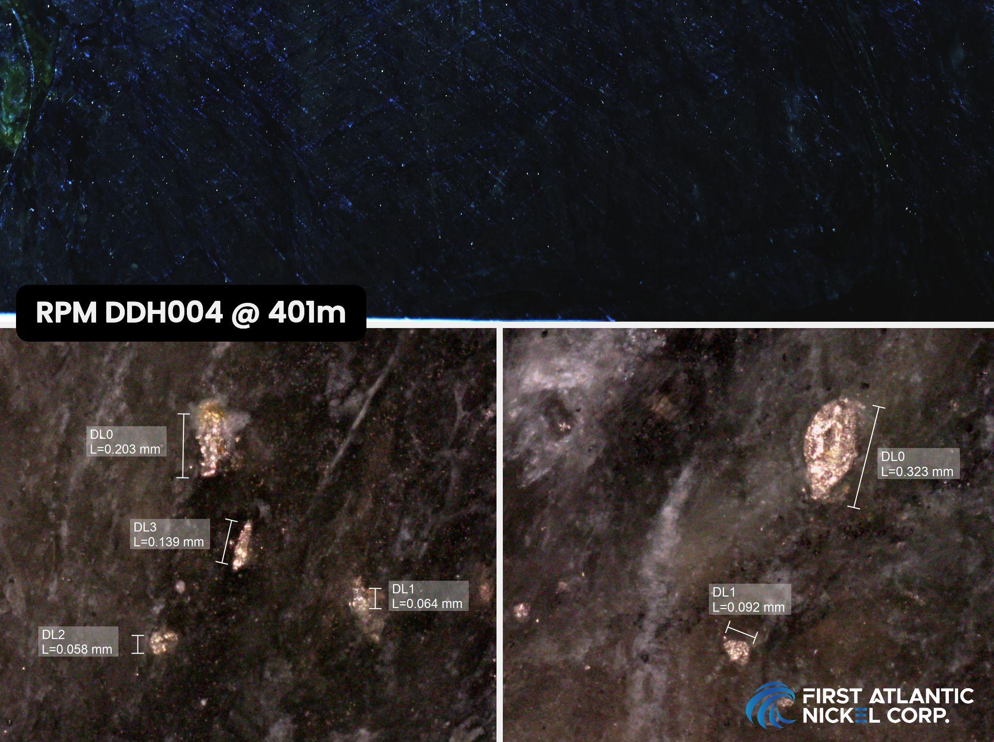 Figure 3: Drill core RPM DDH004 at 401 meters depth. Top image: Abundant, visibly disseminated awaruite grains (typically 50-100 microns, with some up to 323 microns). Bottom image: Awaruite grains from RPM DDH004 at 401 meters depth under a microscope, showing grains well above 10 micron size required for effective magnetic separation and recovery.