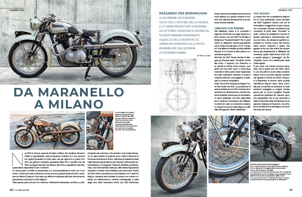 Da Maranello a Milano (passando per Birmingham): la storia della Taurus G27 vede la progettazione del suo motore in terra emiliana da parte di Vittorio Guerzoni su richiesta di Enzo Ferrari, ispirandosi a quello della Norton CS1. Verrà poi montato sulle moto assemblate all’ombra della Madonnina dall’azienda di Giovanni Fabbri.