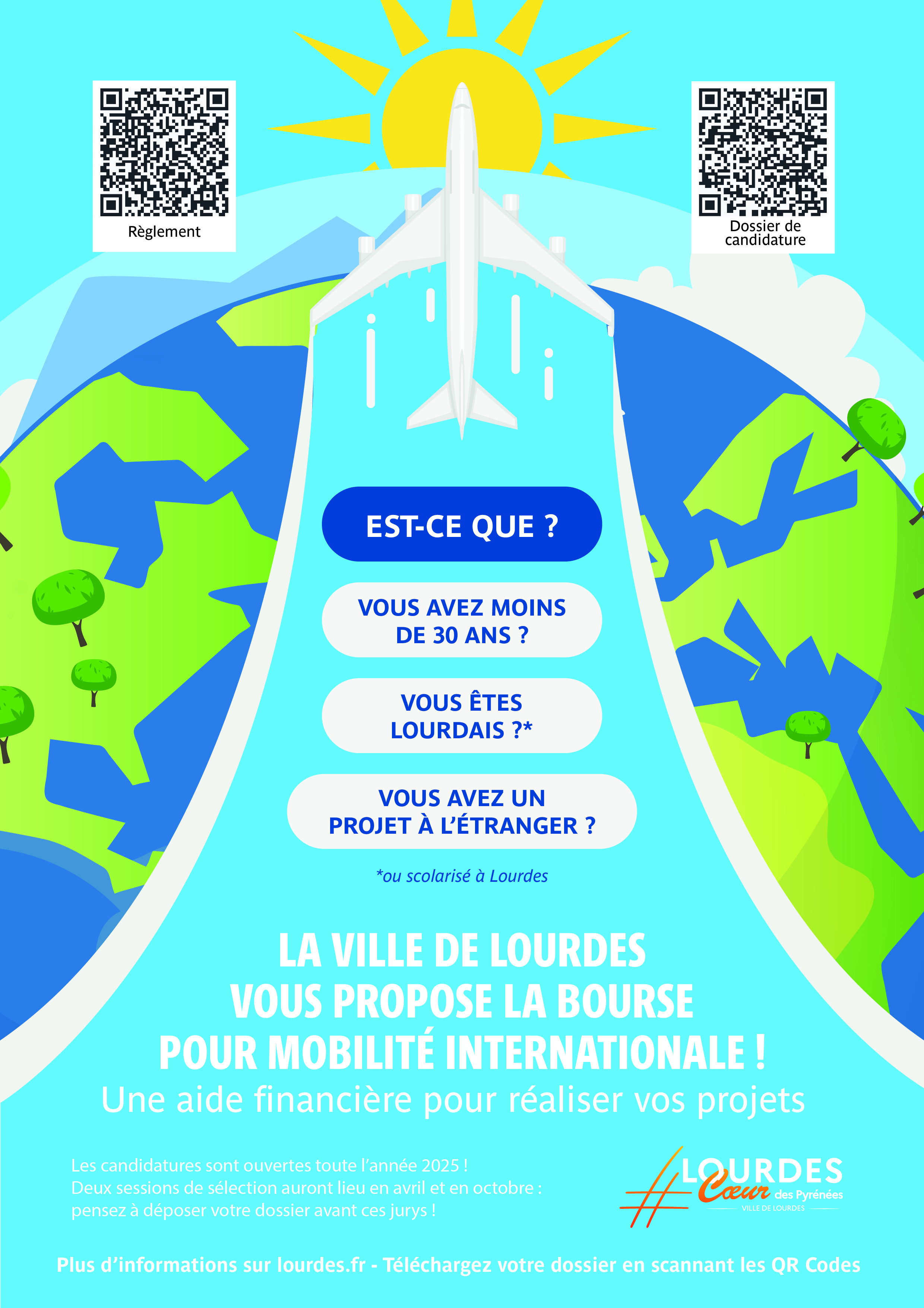 La Ville de Lourdes se réjouit de les accompagner dans cette aventure humaine, professionnelle et interculturelle. À leur retour, ces jeunes reviendront enrichis de nouvelles compétences, d’expériences inspirantes et d’une vision élargie du monde, qu’ils partageront lors d’une soirée réunissant l’ensemble des boursiers en fin d’année. Ce moment convivial permettra de valoriser leurs parcours, de partager leurs témoignages et d’inspirer d’autres jeunes à s’engager dans un projet à l’international. La date de cette soirée sera communiquée ultérieurement.