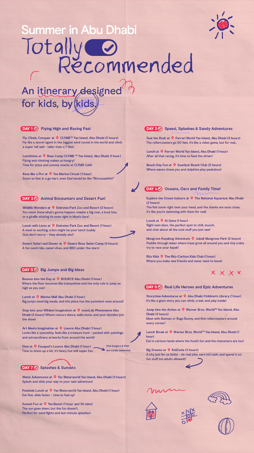 To bring our research to life, we handed the holiday planning over to the children themselves. The result was a seven-day itinerary created by kids, filled with waterparks, wildlife, culture, creativity and plenty of downtime. It’s joyful, balanced, and most importantly, it’s all possible right here in Abu Dhabi. A place that speaks the language of children: curious, imaginative and full of heart.