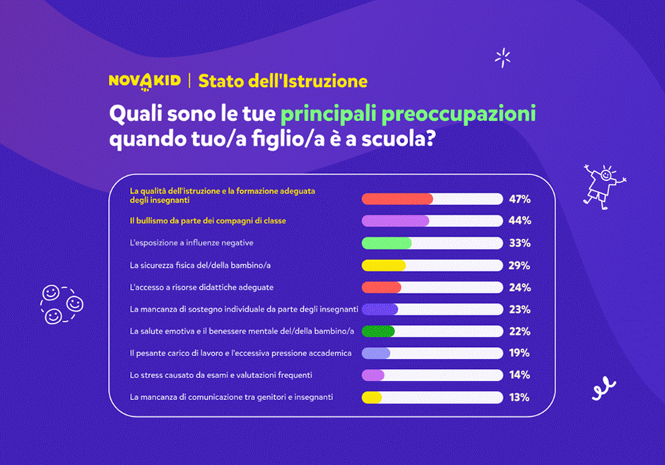 Lo studio "Stato dell'Educazione" condotto in Italia dalla piattaforma educativa Novakid tra i genitori ha dimostrato che il 44% di loro teme che il proprio figlio diventi vittima di violenza tra pari e non sappia se e dove cercare sostegno. Per i genitori, la priorità è creare uno spazio sicuro e accogliente nelle scuole, dove i bambini possano svilupparsi liberamente, acquisire conoscenze, costruire relazioni sane e, in caso di problemi, avere un sostegno sotto forma di istituzioni e personale qualificato. Gli intervistati hanno sottolineato la necessità di maggiori finanziamenti per gli psicologi scolastici e gli insegnanti e l'attuazione di programmi che aumentino la consapevolezza di come affrontare le manifestazioni di aggressività.