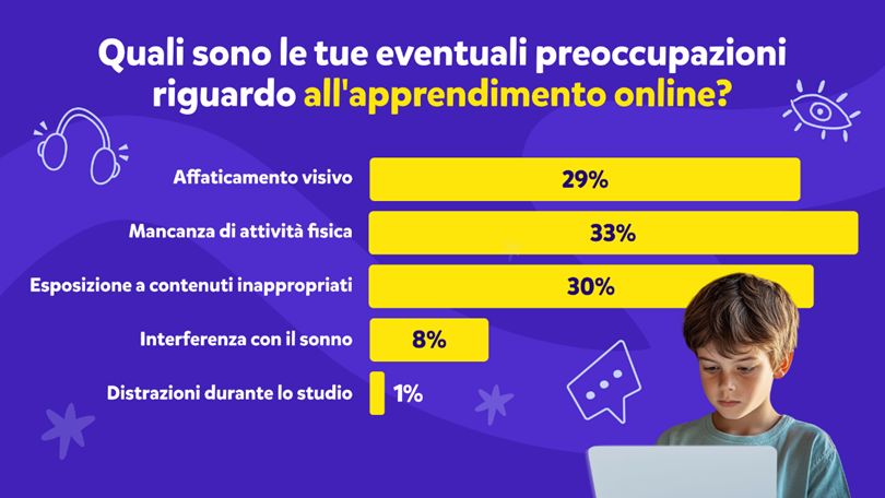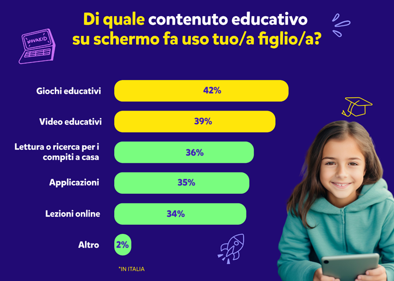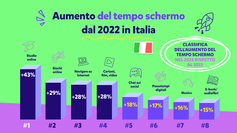 In Italia il sondaggio rivela che il tempo schermo dedicato allo studio è cresciuto del +43%, seguito dai giochi online (+29%) e dalla navigazione su Internet (+28%).