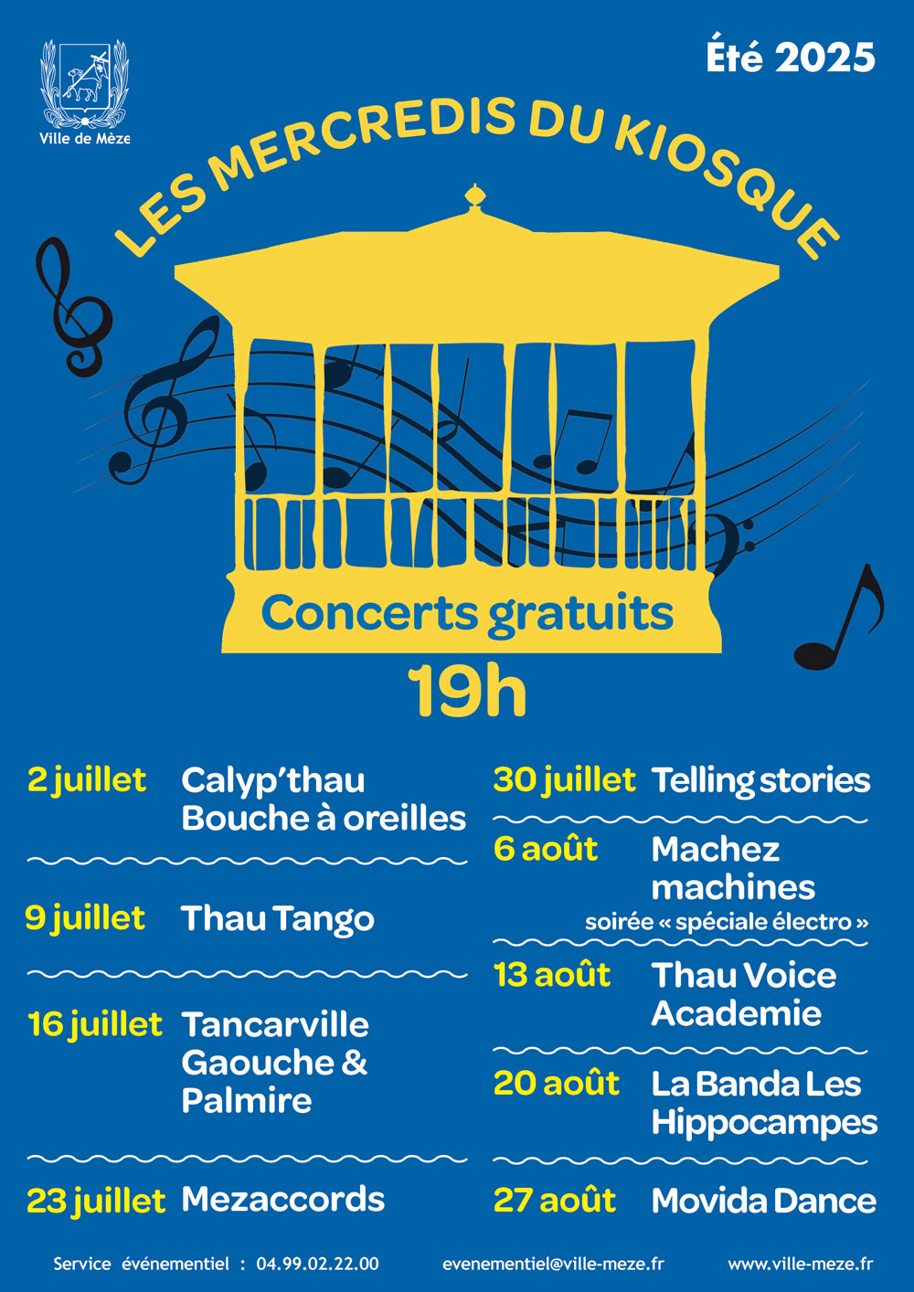 Concerts latino, électro, chansons françaises, danse de tango, chorales ou fanfares… chaque mercredi de l’été, dès le 2 juillet, de 19h à 21h, « Les mercredis du kiosque » animeront l’esplanade Yves Piétrasanta à l’occasion de soirées conviviales devenues incontournables. La Ville de Mèze, à l’initiative d’Eve Gimenez-Silva, adjointe à l’évènementiel, propose une scène ouverte sur le kiosque aux artistes amateurs. Ambiance festive assurée !