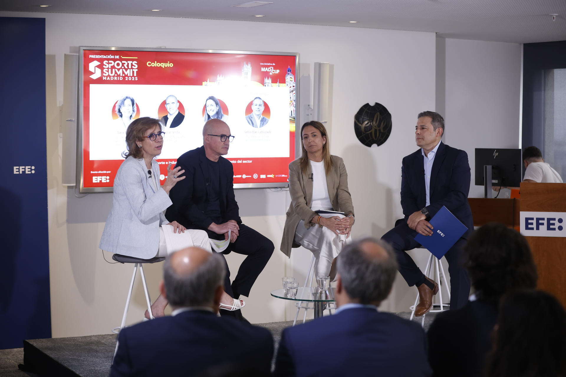 De izquierda a derecha Sara Bieger, CEO de la Cámara Franco- Española de Comercio e Industria; Óscar Vilda, CEO de DAZN España y Portugal; Inmaculada Benito, Directora del departamento de Turismo, Cultura y Deporte del CEOE y Sebastián Lateulade, Fundador y CEO de Sports Summit Global , este martes durante la presentación del «Sports Summit Madrid 2025» en la sede de la Agencia EFE en Madrid. EFE/David Fernández