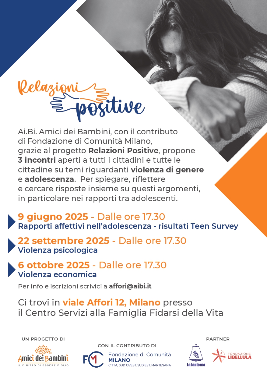 Nell’ambito del progetto Relazioni Positive Costruire reti di comunità per il benessere di donne e ragazze, promosso da Ai.Bi. Amici dei Bambini con il contributo della Fondazione di Comunità Milano, il centro Fidarsi della Vita e l’associazione Libellula propongono tre incontri gratuiti sul tema della violenza di genere, con uno sguardo particolare all’età adolescenziale.