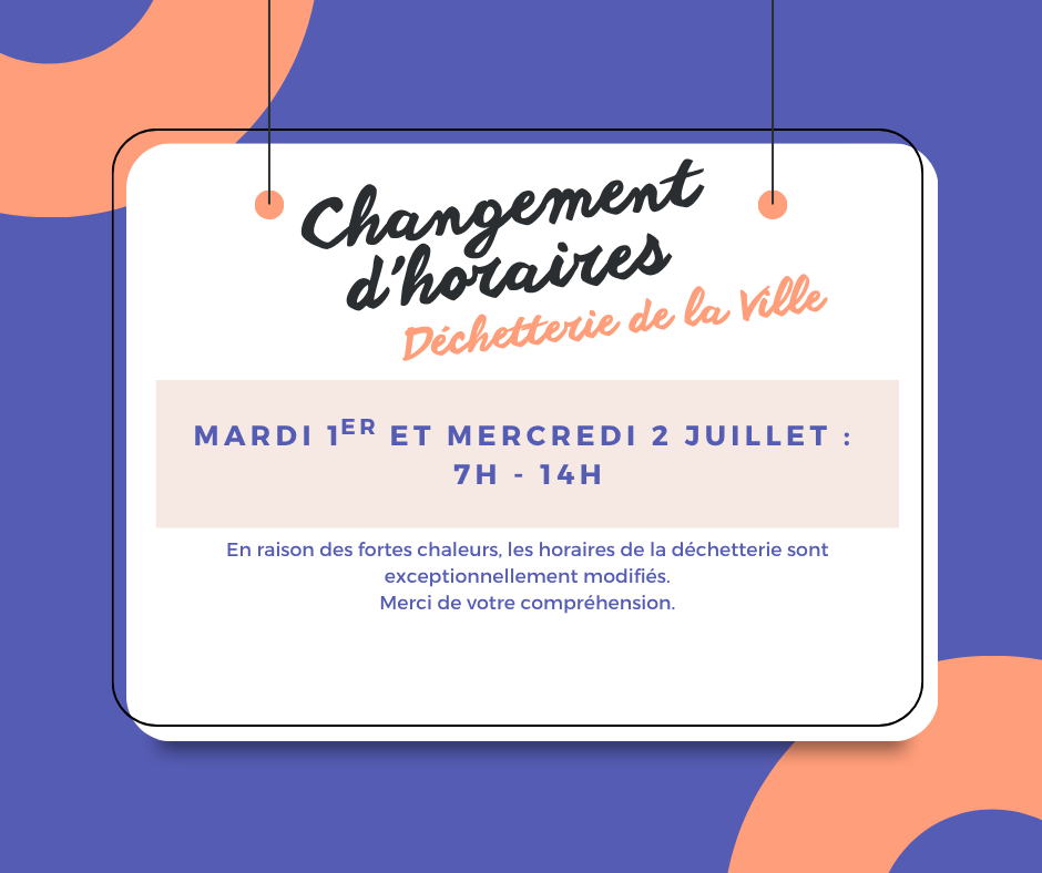 Dans ce contexte de fortes chaleurs, nous vous informons que la déchetterie, habituellement ouverte toute la journée les mardis et mercredis, sera exceptionnellement ouverte aujourd’hui et demain de 7h à 14h.