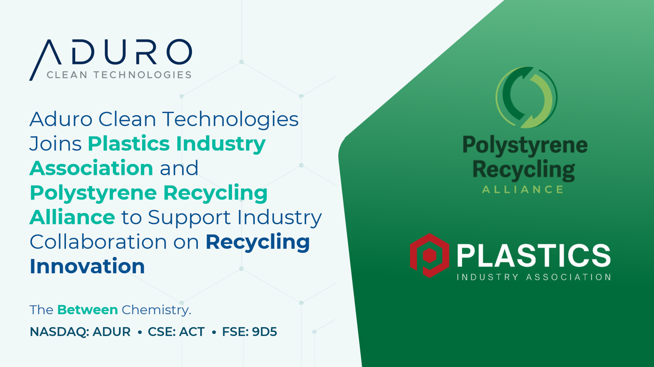 LONDON, Ontario, 18 juill. 2025 (GLOBE NEWSWIRE) -- Aduro Clean Technologies Inc. (ci-après « Aduro » ou la « Société ») (Nasdaq : ADUR) (CSE : ACT) (FSE : 9D5), une société de technologie propre qui recycle chimiquement les matières premières de moindre valeur comme les déchets plastiques, le bitume lourd ou les huiles renouvelables en ressources adaptées au XXIe siècle, a annoncé ce jour son adhésion à la fois à la Plastics Industry Association (PLASTICS) et à la Polystyrene Recycling Alliance (PSRA), en vue d’une collaboration initiée par PLASTICS, axée sur les avancées en matière de solutions de recyclage du polystyrène.