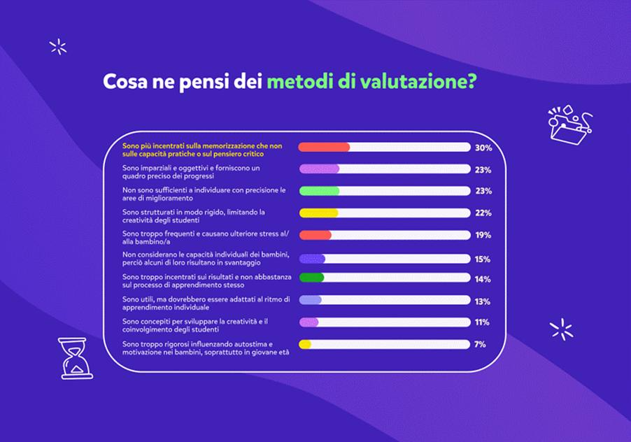 Più positive le opinioni sui metodi didattici: visto che circa la metà degli intervistati li ritiene abbastanza soddisfacenti. Mentre destano preoccupazioni i criteri e i sistemi di valutazione applicati dalla scuola. Per il 30% degli intervistati infatti risultano troppo incentrati sulla memorizzazione e poco sul pensiero critico e per il 23% non sono sufficienti a individuare con precisione le aree di miglioramento del bambino. Secondo il 19% dei genitori, inoltre, l’eccessiva frequenza dei test di valutazione è causa di ulteriore stress per lo studente. In generale i criteri di valutazione sono ritenuti troppo rigidi e poco adatti a riflettere accuratamente le capacità o il potenziale dei bambini. I genitori, dunque, sarebbero favorevoli ad approcci di valutazione più personalizzati che riconoscano i diversi stili di apprendimento e misurino la crescita nel tempo, piuttosto che le prestazioni in un singolo test standardizzato.