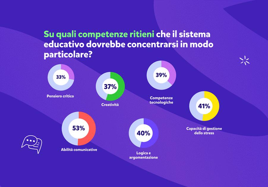 Venendo alla questione centrale, ovvero quali sono le competenze sulle quali secondo i genitori la scuola dovrebbe concentrarsi, le abilità comunicative e il pensiero logico/argomentativo sono ai primi posti rispettivamente per il 53% e il 40% dei genitori. Interessante notare anche come per il 41% sia importante anche che la scuola trasmetta al bambino la capacità di gestire lo stress. Le competenze tecnologiche e lo sviluppo della creatività, invece, sono fondamentali per il 39% e per il 37% dei genitori intervistati. Anche in questo caso le aspettative dei genitori non sono soddisfatte visto che alla domanda “Quanto pensi che il programma sia adeguato allo sviluppo delle suddette competenze?” i pareri si dividono nettamente in tre, tra chi è soddisfatto (31%), chi è neutrale (32%), e chi invece è critico (36%). (Segue infografica)