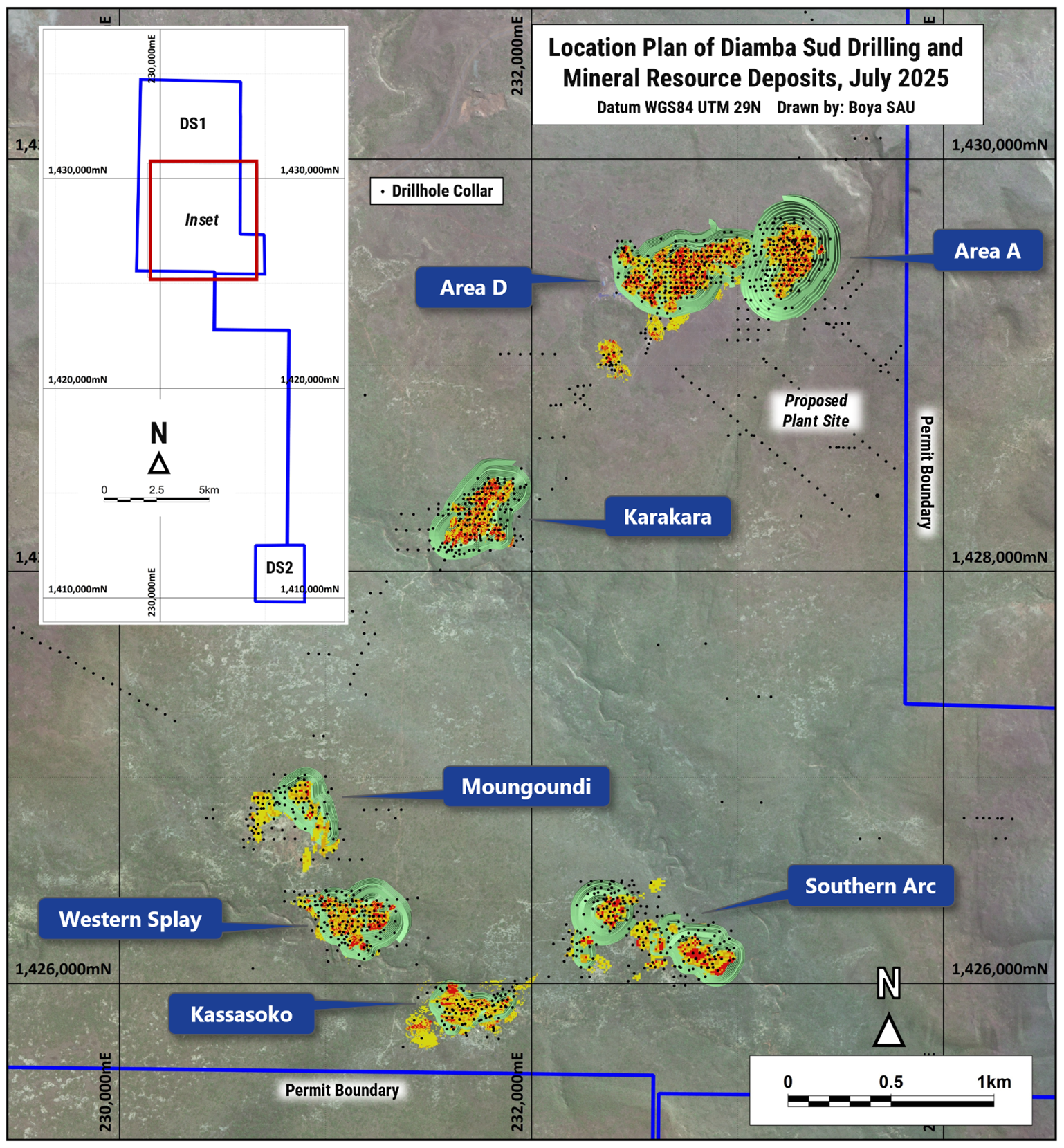 The Mineral Resource is comprised of seven deposits: Area A, Area D, Karakara, Western Splay, Kassassoko, Southern Arc, and Moungoundi. It incorporates data from a total of 1,178 diamond and reverse circulation (RC) drill holes, totaling 154,814 meters, completed at these deposits since 2019 (see Figure 1).