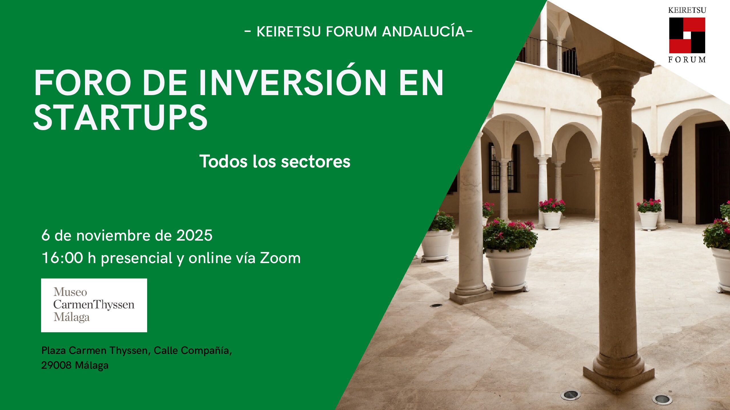 El próximo Foro de Inversión Keiretsu Forum Andalucía se celebrará el jueves 6 de noviembre en el prestigioso Museo Carmen Thyssen de Málaga a las 16:00h.