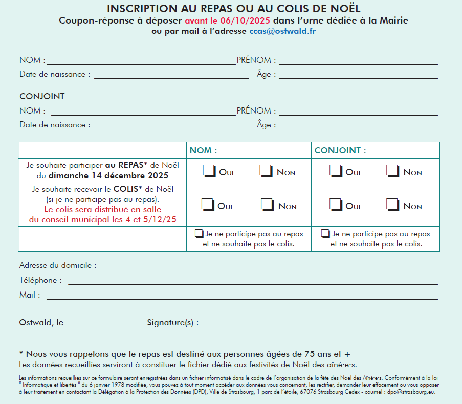 Pour réserver votre repas OU votre colis*, merci de compléter le coupon-réponse ci-dessous et de le retourner avant le 6 octobre, dans l’urne disposée à l’accueil de la mairie ou par mail au CCAS à l’adresse : ccas@ostwald.fr.