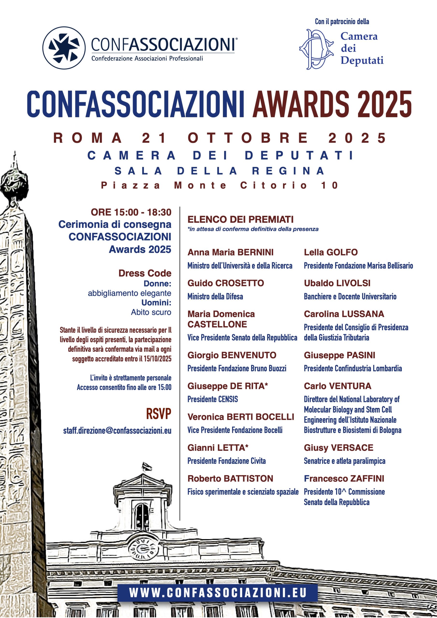 Roma, 1° ottobre 2025 – “I CONFASSOCIAZIONI Awards, i nostri premi etici, valoriali e istituzionali, celebrano la loro Quarta Edizione il 21 ottobre 2025 presso la Sala della Regina di Palazzo Monte Citorio con il patrocinio della Camera dei Deputati e della sua Presidenza”. Lo ha dichiarato in una nota il Presidente di CONFASSOCIAZIONI, Angelo DEIANA.