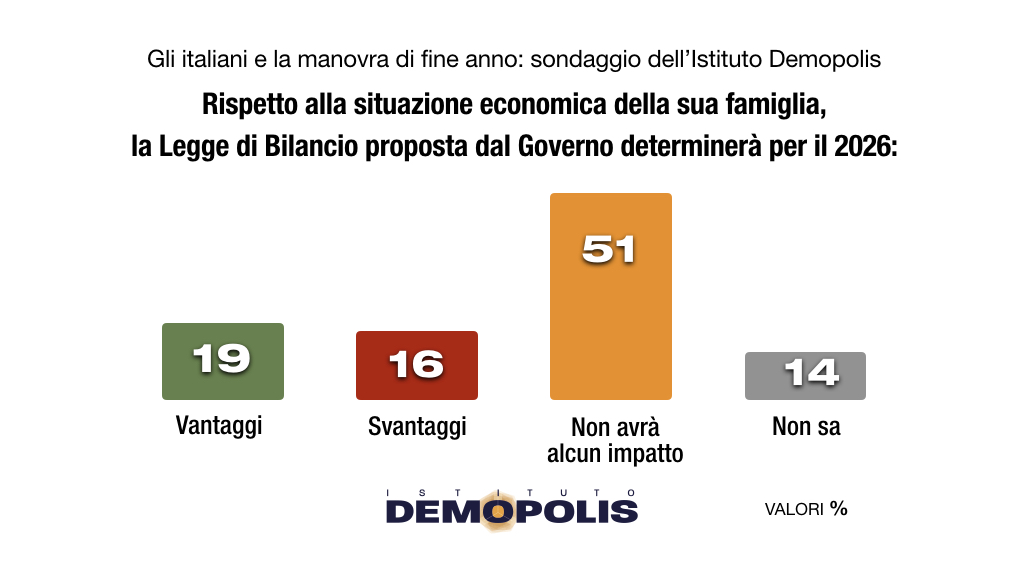 Per il 19% determinerà dei miglioramenti; per il 16% gli effetti saranno negativi. Ma per il 51%, la maggioranza assoluta degli italiani, la Manovra non avrà alcun impatto sostanziale sulla propria situazione economica familiare. È quanto emerge dall’indagine realizzata dall’Istituto Demopolis.
