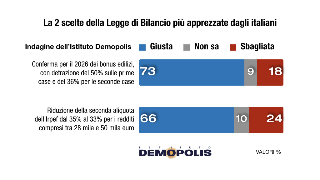 Due scelte della legge di bilancio risultano condivise dagli italiani, senza specifiche polarizzazioni politiche: il 73% apprezza la conferma per il 2026 dei bonus edilizi, con la detrazione del 50% per le prime case; il 66% approva la riduzione della seconda aliquota Irpef dal 35 al 33% per i redditi annuali tra i 28 e i 50 mila Euro.