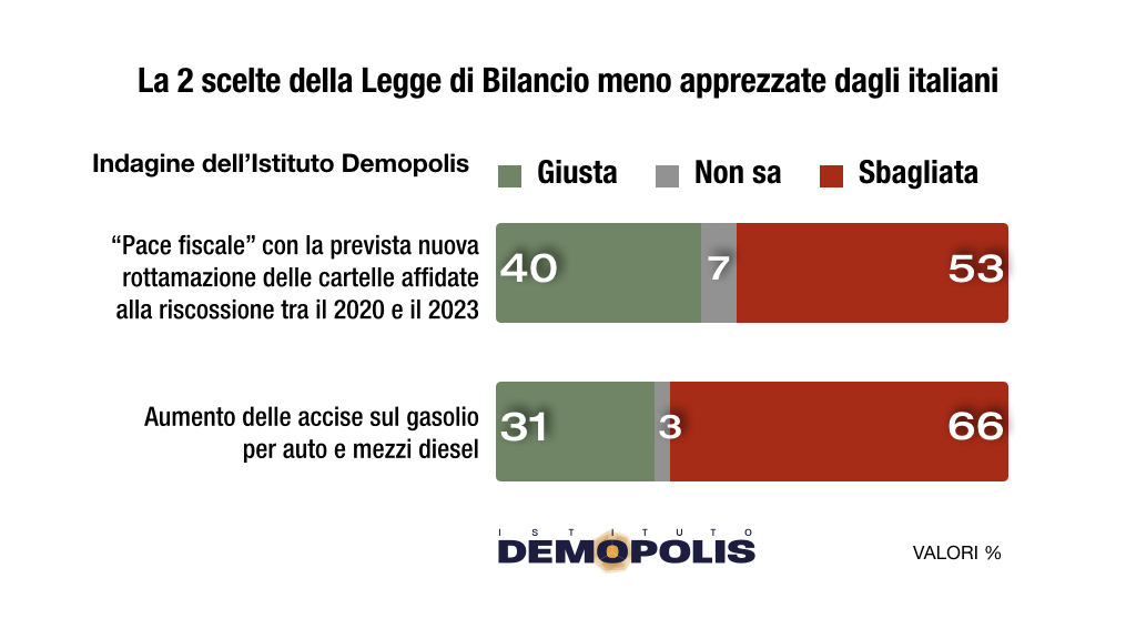Di segno diverso il giudizio su due misure della manovra meno apprezzate. Il 53% degli italiani ritiene sbagliata la “pace fiscale”, con la prevista rottamazione delle cartelle affidate alla riscossione tra il 2020 e il 2023. Il 66% risulta critico sul previsto aumento delle accise sul gasolio per auto e mezzi diesel: in un Paese nel quale circolano oltre 16 milioni di auto a gasolio, la scelta è ritenuta giusta da meno di un terzo degli intervistati.