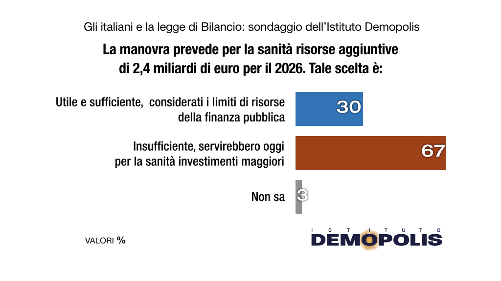 La legge di Bilancio prevede risorse aggiuntive per la sanità per un ammontare di 2,4 miliardi di euro. È una decisione che 3 cittadini su 10, intervistati da Demopolis, ritengono utile e sufficiente, considerati i limiti delle risorse disponibili. Ma, per il 67%, la somma stanziata in manovra è invece insufficiente, in quanto oggi servirebbero per la sanità investimenti maggiori.